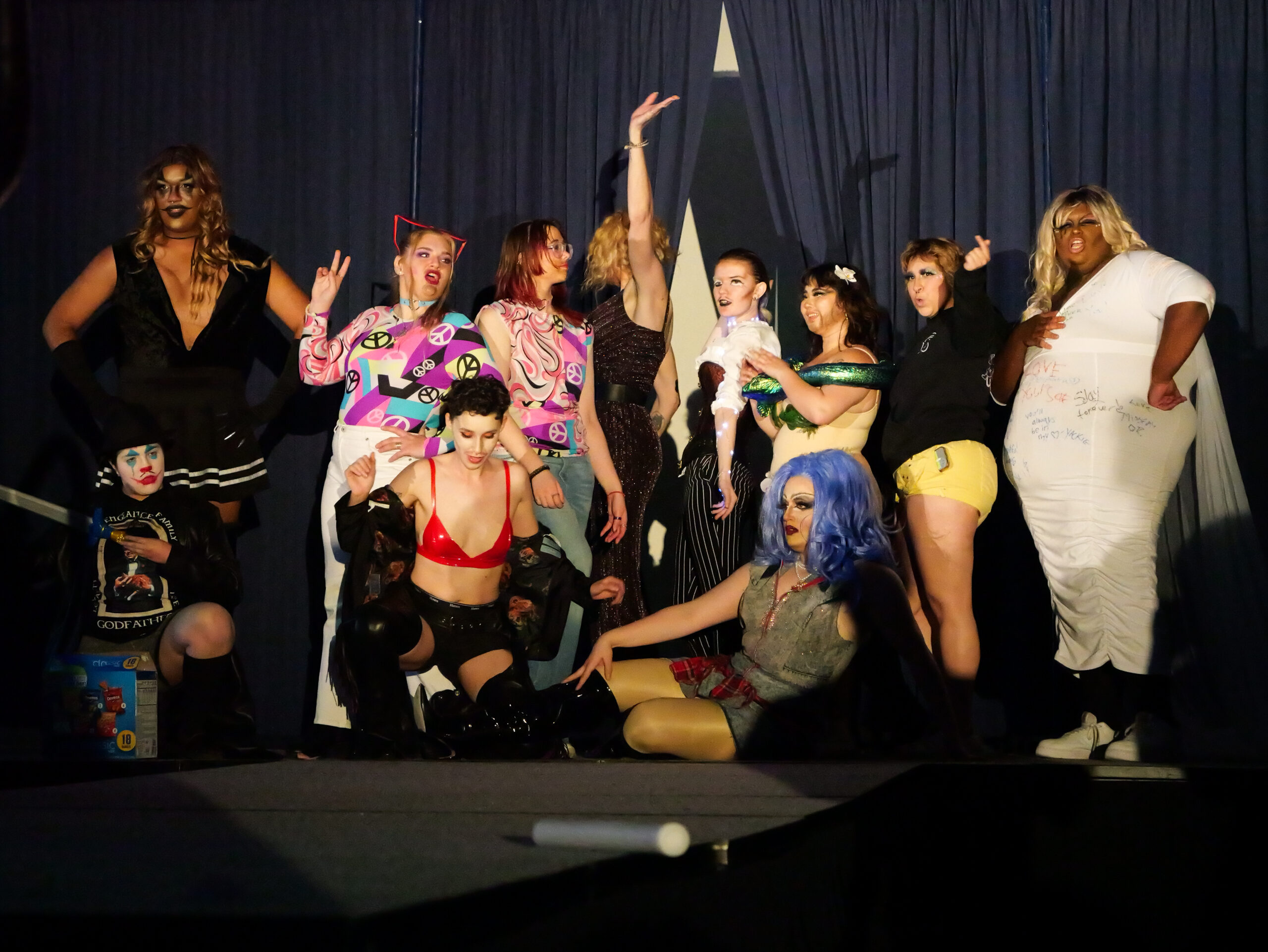 Static noise opened up the next performance by Drag Club’s President, Killian, known by their drag name Melodrama. Dressed in a black hoodie, dark shades and sweatpants, Melodrama’s set changed between various songs from the early 2000s that had many millennials nostalgic and Gen Z dancing. Screams and shouts from the crowd made Melodrama’s performance even more exciting, especially as they underwent an onstage outfit change that revealed a sleek black dress that complimented their bold performance of “Naughty Girl” by Beyoncé and “Toxic” by Britney Spears.