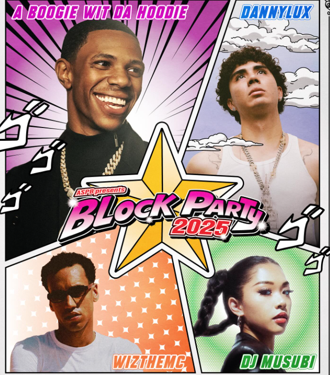 This year’s Block Party tries to continue this tradition, going off of the theme of “Jojo’s Bizarre Adventure.” Opulent purple text referencing the series could be found throughout the event, most notably being seen on the screens overlooking the stage in which music artists such as Boogie Wit Da Hoodie and DannyLux performed. Merchandise referencing Jojo’s Bizarre Adventure was also given out on the day of the event.