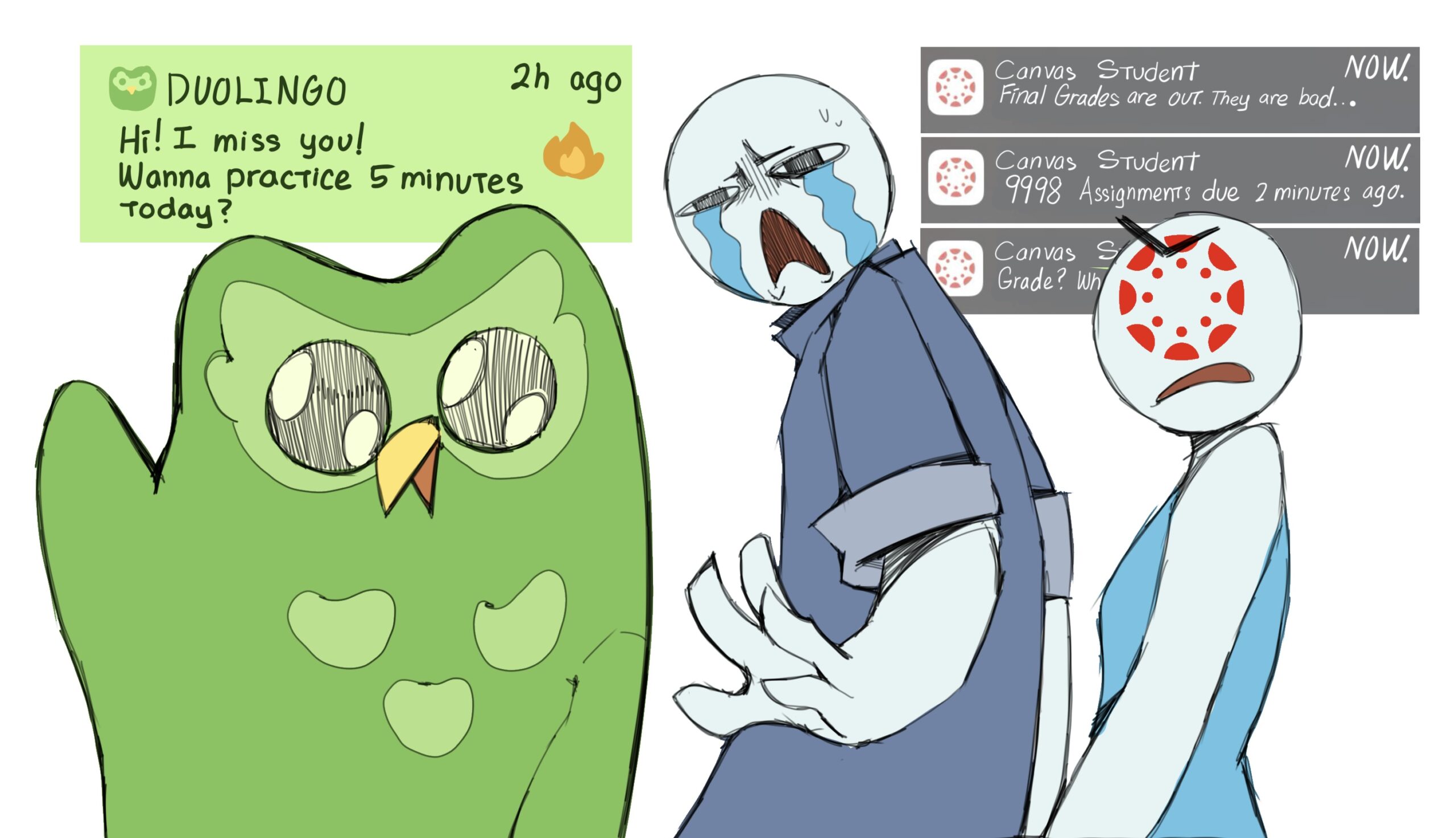 Yes, you guessed it right. That is the Canvas app coming for you like how the “Nun” attacked in the “Conjuring” from the painting. Canvas is even scarier than the Duolingo owl. That creepy yet innocent green creature will definitely haunt your dreams, roast you like you don’t have any respect and motivate you to learn a new language all at the same time. It’s unsettling, yes, but not as much as the Canvas notifications. Those will derail your life at the worst possible moment, especially when you are having fun over break.