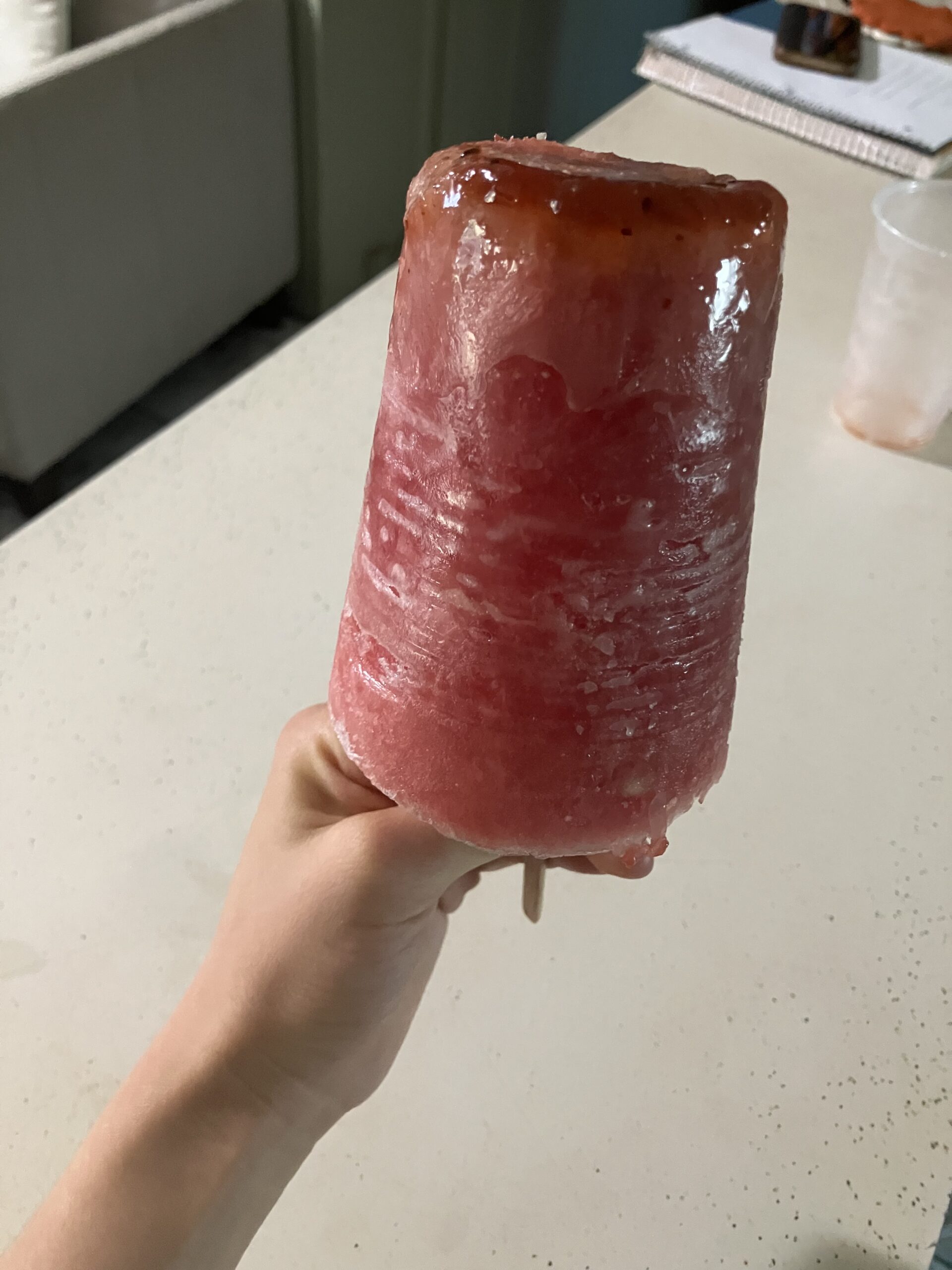 Freeze overnight and plop the popsicle out by squeezing the cup and pulling the stick upward. Enjoy!