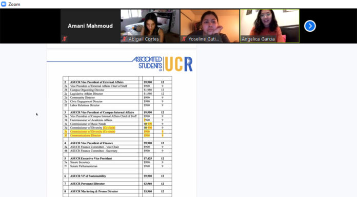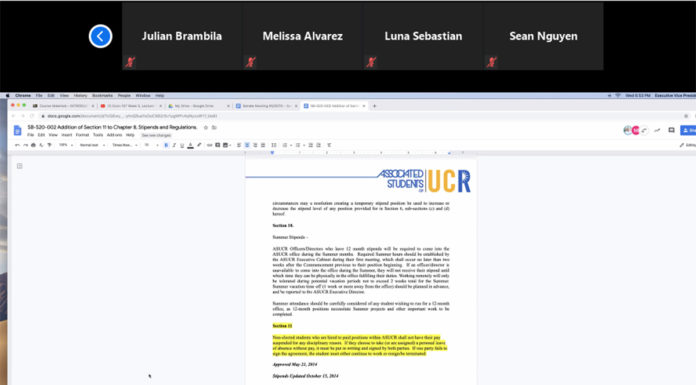 At the ASUCR meeting held on Wednesday, April 29, members of ASUCR debated SB-S20: Addition of Section 11 to Chapter 8 Stipends and Regulations.
